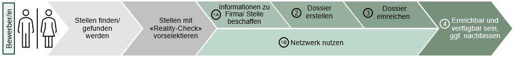 Aus Sicht der Bewerbenden sind typischerweise die in der nachfolgenden Abbildung 2 dargestellten Schritte erfolgreich zu absolvieren, um eine Intervieweinladung zu erhalten. Die ersten beiden, grau eingefärbten Aktionen wurden bereits in den Artikeln «Gefunden werden» und «Reality Check für den Arbeitsmarkt» beschrieben. Die grün eingefärbten Prozessschritte (1A bis 4) und die dazugehörigen Erfolgsfaktoren werden nachfolgend erläutert.