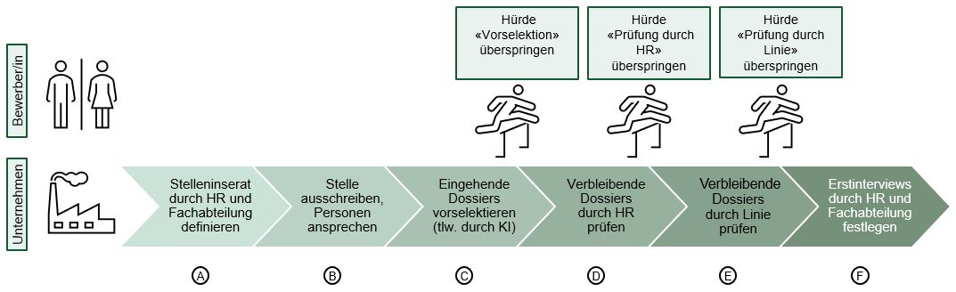 Bei der Personalgewinnung arbeiten im Regelfall die Fachabteilung (Linie) und Human Resources (HR) zusammen. Die Linie bestimmt dabei massgeblich die Anforderungen. HR organisiert den Prozess, setzt mit der Fachabteilung das Stelleninserat auf, sorgt für dessen zielgruppengerechte Kommunikation und koordiniert die Bearbeitung der eingehenden Bewerbungsdossiers. Im nächsten Schritt erfolgt häufig durch HR die erste Vorselektion, in der die CVs geprüft und nicht passende Dossiers (C-Bewerbungen) aussortiert werden. Diese Vorselektion wird immer mehr durch Künstliche Intelligenz (KI) unterstützt oder sogar autonom von der KI durchgeführt. Anschliessend prüft HR bei den verbliebenen Bewerbungen die ganzen Dossiers und wendet dabei Kriterien an, die im Artikel Reality-Check beschrieben sind. Als Ergebnis dieser Prüfung entsteht eine Longlist, die an die Fachabteilung zur Beurteilung übermittelt wird. Schlussendlich legen HR und die Linie gemeinsam fest, wer zu einem Interview eingeladen wird. Somit ist es für die Bewerbenden entscheidend, HR, die Fachabteilung und auch eine allfällige Künstliche Intelligenz zu überzeugen, um zu einem Interviewtermin zu gelangen.